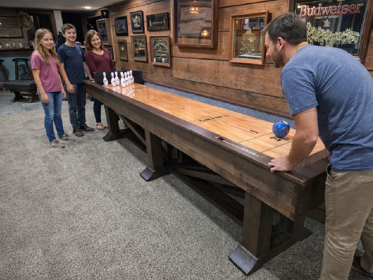 Shuffleboard play surfaces use the same hardwood as bowling lanes.